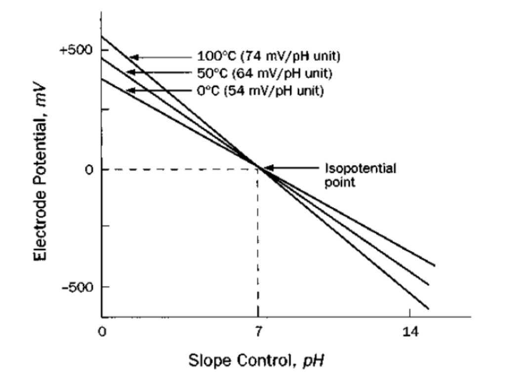 La pendiente del electrodo representa la variación de potencial (mV) que genera un electrodo por cada unidad de pH. De acuerdo con la ecuación de Nernst, esta pendiente aumenta proporcionalmente con la temperatura.