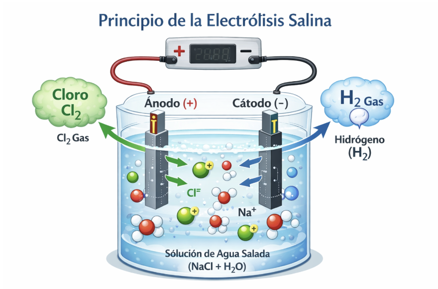 El proceso de desinfección se implementa mediante la adición de sal al agua de la piscina y la instalación de una celda electrolítica equipada con electrodos de generación en la línea de recirculación. El cloro producido no permanece en forma gaseosa, sino que reacciona inmediatamente con el agua para formar ácido hipocloroso (HOCl) e ion hipoclorito (OCl⁻). Estas especies constituyen el denominado cloro libre, siendo el ácido hipocloroso el principal responsable de la acción desinfectante, con mayor eficacia en un rango de pH entre 6,5 y 7,2.