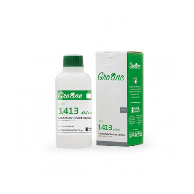 GroLine 1,413 uS calibration solution, box, certificate of analysis, 120 ml