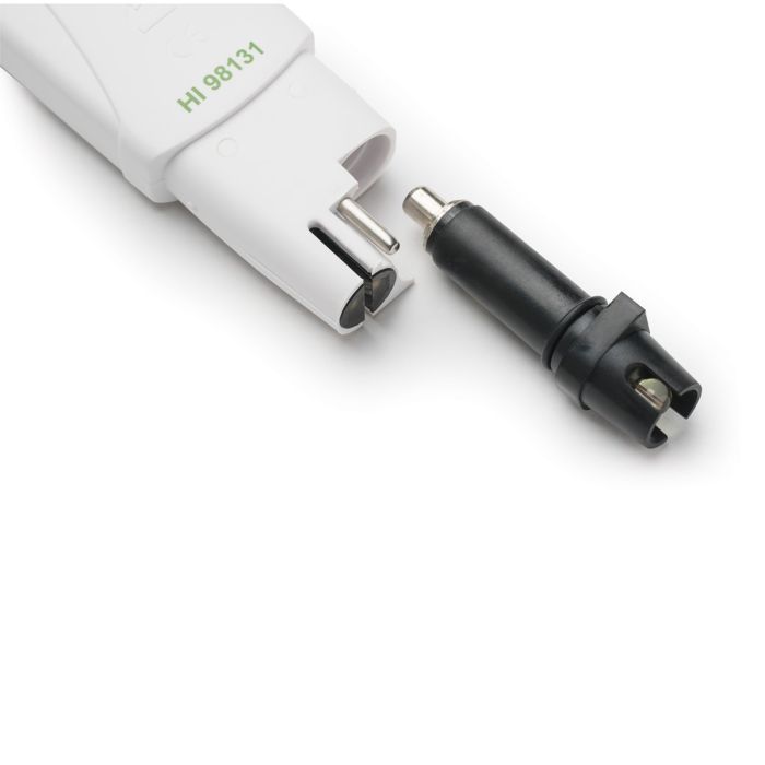 Calibración simplificada con un solo botónLa calibración de pH de uno o dos puntos es automática para un conjunto de tampones preprogramado (4.01, 7.01 y 10.01) o calibración de pH y CE de un solo punto con la solución de calibración Hanna Quick Cal. Para realizar una calibración de calibración rápida, simplemente presione y mantenga presionado el botón izquierdo de encendido/modo mientras está en el modo de medición durante tres segundos y suéltelo para ingresar al modo de calibración. Una vez que tanto el pH como la EC están calibrados, se muestra “CAL OK” y el medidor vuelve al modo de medición.HI73127 Electrodo de pH reemplazableEl HI99131 se suministra con el electrodo de pH reemplazable HI73127. Este electrodo cuenta con una unión extraíble que se puede extraer 1/8 ″ para eliminar cualquier obstrucción que provoque lecturas erráticas y desviadas.