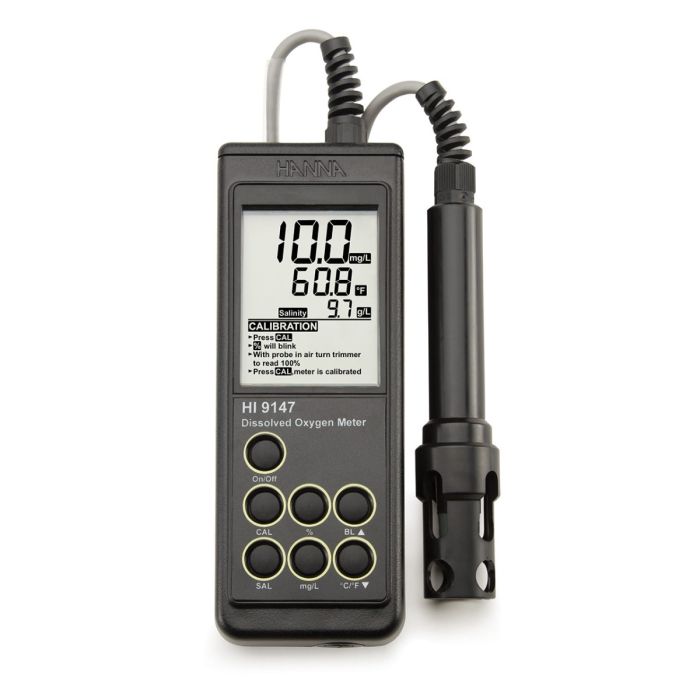 Dissolved oxygen is a commonly measured parameter in aquaculture, wastewater treatment, environmental studies, and wine analysis. The HI9147 is a rugged, water-resistant dissolved oxygen (DO) meter designed to provide precision and accuracy under harsh environmental conditions. The meter features a manual one point calibration, automatic temperature compensation, and salinity and altitude compensation. The HI9147 includes a galvanic probe with replaceable high-density polyethylene (HDPE) membrane caps and a protective shield.The salinity compensation allows for the determination of dissolved oxygen even in salty waters making this an ideal meter for aquaculture applications. The HI9147 is supplied complete and ready to use.