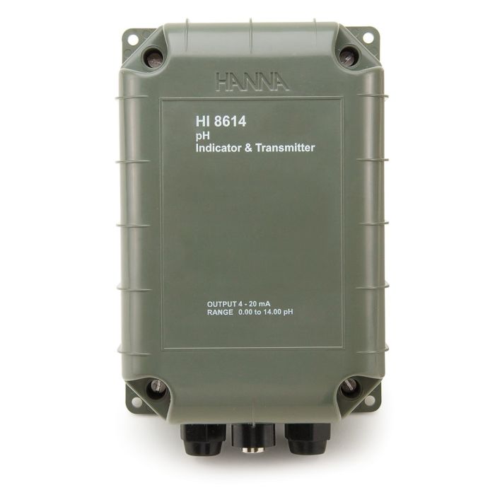 Two-Wire pH TransmittersHI 8614 is?2-wire water-resistant transmitter?specially designed for long distance measurement of pH in industrial applications.Two-wire transmitters are widely used for process control in industry. These instruments are particularly useful in industrial conditions where electrical interference is an important factorBy galvanically isolating the signals, any interference created is prevented from reaching the transmitter. Industrial environments are often associated with corrosive conditions, therefore any instrumentation used must be resistant to liquids and corrosion. Hanna transmitters meet all of these criteria and they only use two wires which reduces costs and eliminates the need for an expensive coaxial cable. Two-wire transmitters are ideal when used in remote applications that do not have AC power available.