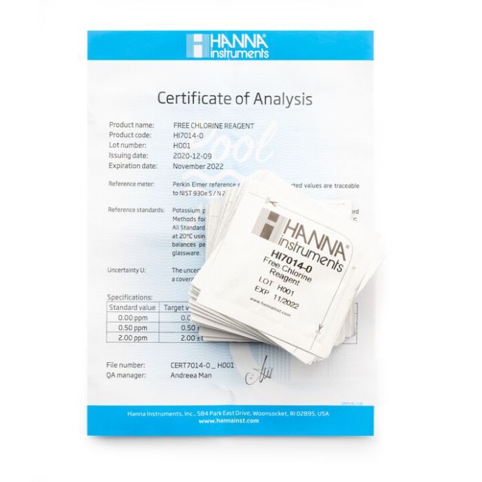 Los Reactivos Checker HC para Cloro Libre Línea Piscina HI7014-25 son reactivos de alta calidad que se miden previamente, lo que permite a los usuarios lograr mediciones rápidas y precisas con el Checker® HC de Cloro Libre HI7014. Estos reactivos siguen el método DPD en el que la reacción entre el cloro y el reactivo provoca un color rosado en la muestra. Al agregar el sobre de reactivo HI7014-25 a la muestra, se producirá la reacción y el HI7014 determinará la concentración a partir del color que se produce. Los resultados se mostrarán en ppm (mg/L) de cloro libre. Los Reactivos Checker HC para Cloro Libre Línea Piscina HI7014-25 están diseñados para usarse al medir el agua de piscinas, jacuzzis o spas que tienen un rango esperado de 0.00 a 2.50 ppm de cloro libre.