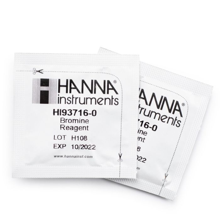 Los HI93716-01 son reactivos de alta calidad preparados previamente lo que permite a los usuarios obtener mediciones colorimétricas rápidas y precisas. Estos reactivos siguen el Método DPD en el cual la reacción entre el bromo y el reactivo provoca un color rosa en la muestra. Al agregar el sobre de reactivo HI93716-01 a la muestra la reacción tendrá lugar y se podrá utilizar un fotómetro compatible para determinar la concentración del color que se produce. Los resultados se mostrarán en mg/L (ppm) de bromo. Estos reactivos están diseñados para ser utilizados con muestras que tienen un rango esperado de 0.00 a 10.00 mg/L de bromo.