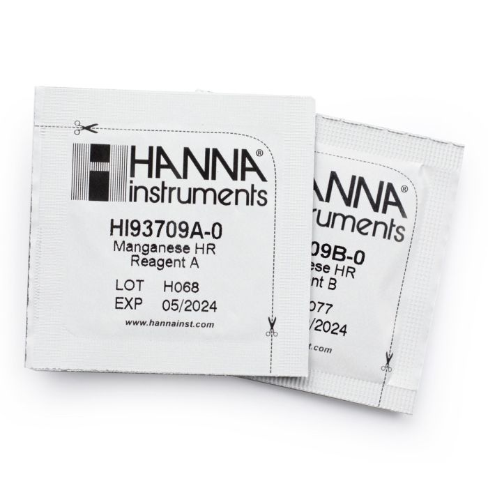 Los HI93709-03 son reactivos para la determinación colorimétrica de manganeso. Contiene suficientes reactivos para 300 pruebas que se utilizan con un fotómetro portátil o de sobremesa compatible. Estos reactivos de alta calidad se fabrican en nuestras instalaciones de última tecnología y están claramente marcados con el número de lote y la fecha de vencimiento en cada paquete para la trazabilidad.