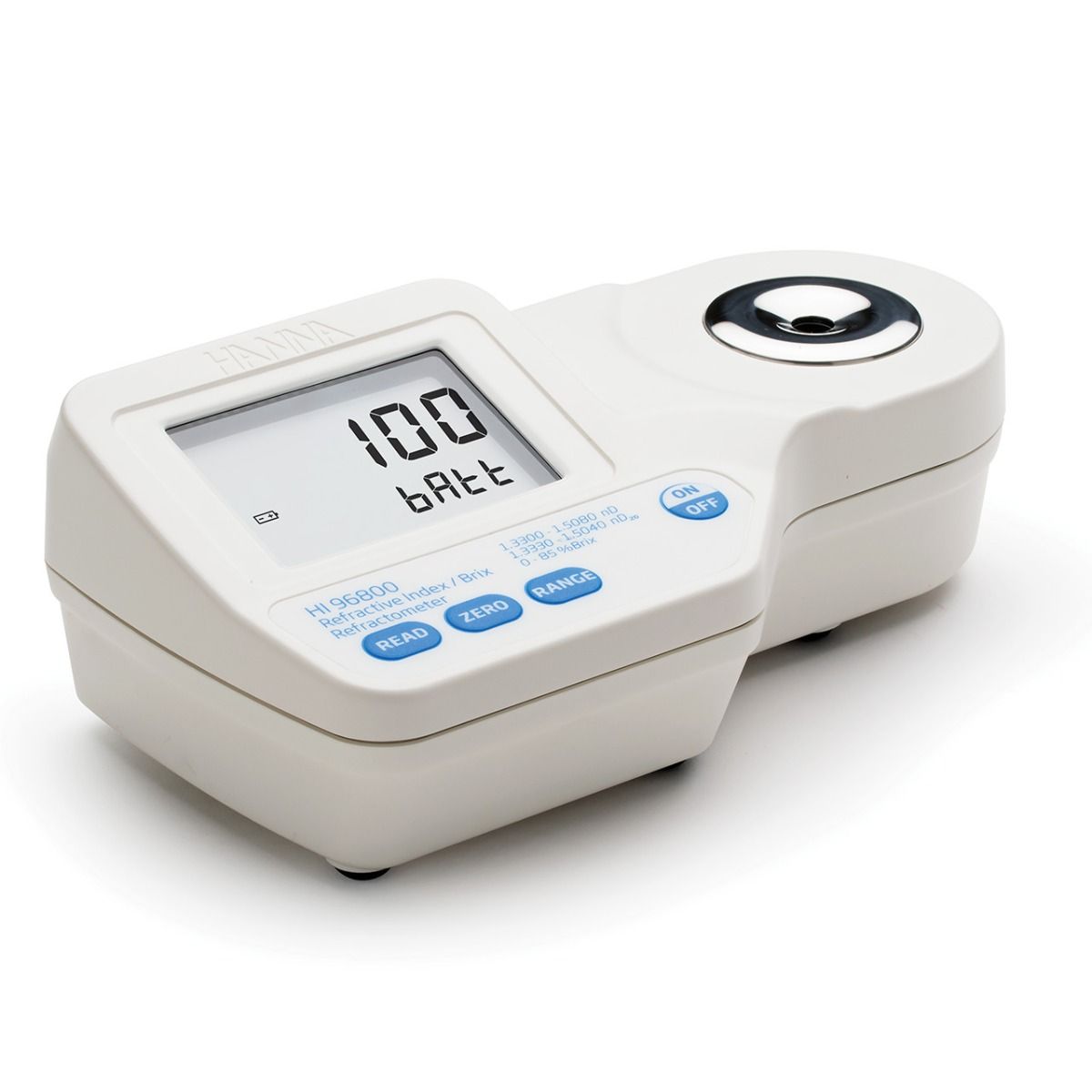 El nuevo Refractómetro Digital de Hanna Instruments HI96800 combina exactitud y funcionalidad en un equipo compacto. Con un tiempo de respuesta de 1,5 segundos, el HI96800 mide el índice de refracción de 1.3330 a 1.5040 con compensación de temperatura (nD20) y de 1.3300 a 1.5080 sin compensación de temperatura (nD). Para mayor versatilidad, el refractómetro también convierte el índice de refracción a % Brix (0-85%). La calibración con un solo botón hace que la configuración sea rápida y fácil.La pantalla LCD mejorada y fácil de leer muestra las unidades de temperatura (°C o °F) y las mediciones de forma simultánea. Al presionar la tecla ‘Rango’ los usuarios pueden cambiar fácilmente entre el índice de refracción (nD), el índice de refracción (nD20) y las lecturas en % Brix mientras está en el modo de medición. La carcasa resistente al agua con clasificación IP65 del HI96800 y el depósito sellado para muestra están diseñados para funcionar bajo condiciones severas, haciéndolo adecuado para ser utilizado en el campo o en el laboratorio.