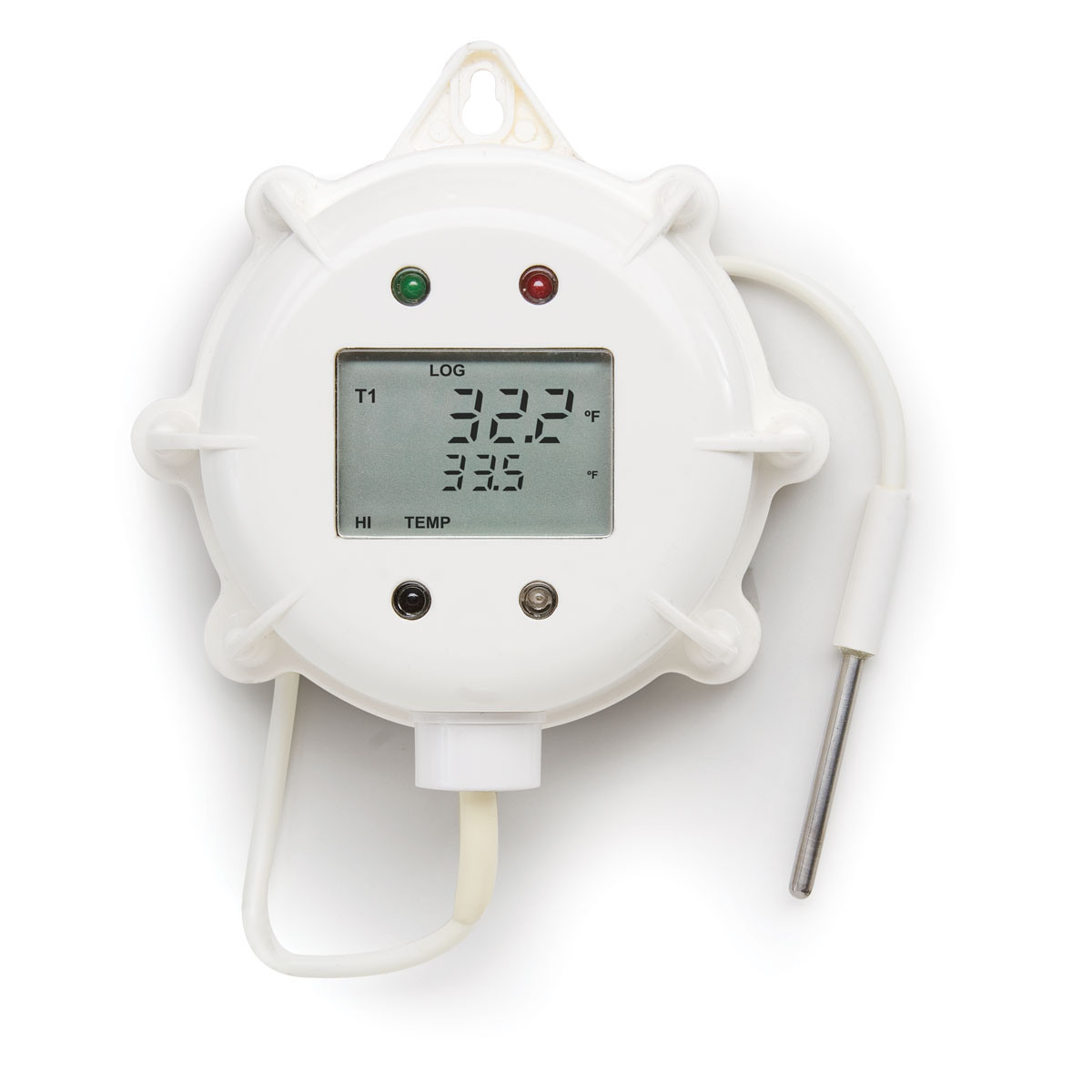 Luces indicadoras de estado – Hay 4 luces LED situadas en la cara de todos los registradores de datos HI141. Los LEDs inferiores superiores se utilizan para la comunicación con el transmisor de infrarrojos, mientras que el estado de registro se indica mediante los 2 LEDs superiores que son de color verde y rojo.
