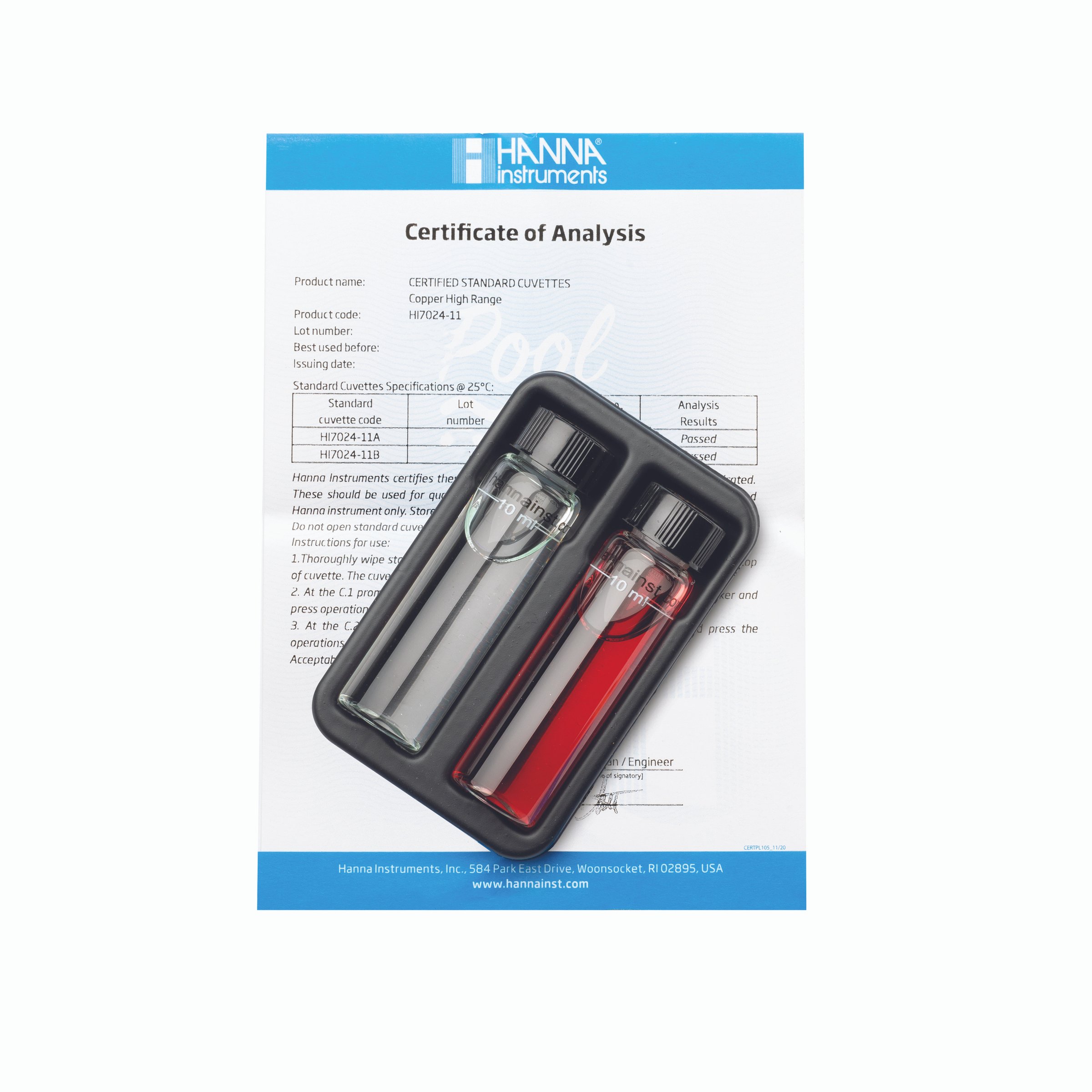 El HI7024-11 es un set de estándares de calibración de alta calidad que permite a los usuarios validar el rendimiento del Checker HC de Cobre Rango Alto HI7024. El HI7024-11 incluye una cubeta sellada para cero ppm de cloro libre y una cubeta con una muestra de cobre con una coloración equivalente a 2.00 +/- 0.10 ppm a 25 C. El set de verificación de calibración se produce en nuestras instalaciones de fabricación de última generación utilizando productos químicos de grado reactivo en un entorno de temperatura controlada.