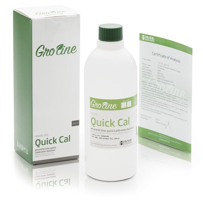 La HI5036-050 es una solución de calibración rápida para usar con los medidores GroLine de pH y/o CE / TDS de Hanna. El uso de la función Quick Cal, que se encuentra en los medidores compatibles, permite una calibración de un solo punto para sensores de pH y/o conductividad. Cada botella tiene el número de lote y la fecha de vencimiento. La línea de soluciones de calibración de Hanna se ha formulado especialmente para tener una caducidad de 5 años a partir de la fecha de fabricación para una botella sin abrir. La HI5036-050 tiene 500 mL de solución de calibración