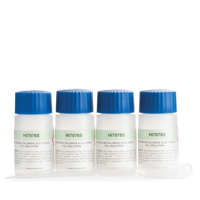 La Solución de Relleno de Cloruro de Sodio 1M HI7076 está fabricada específicamente para el ISE de potasio de doble unión HI4114 y para el electrodo de referencia de doble unión HI5315 cuando se utiliza con el electrodo de media celda HI4014. Esta solución está hecha con químicos de grado reactivo, agua desionizada, balanzas certificadas con control de peso y cristalería de clase A.