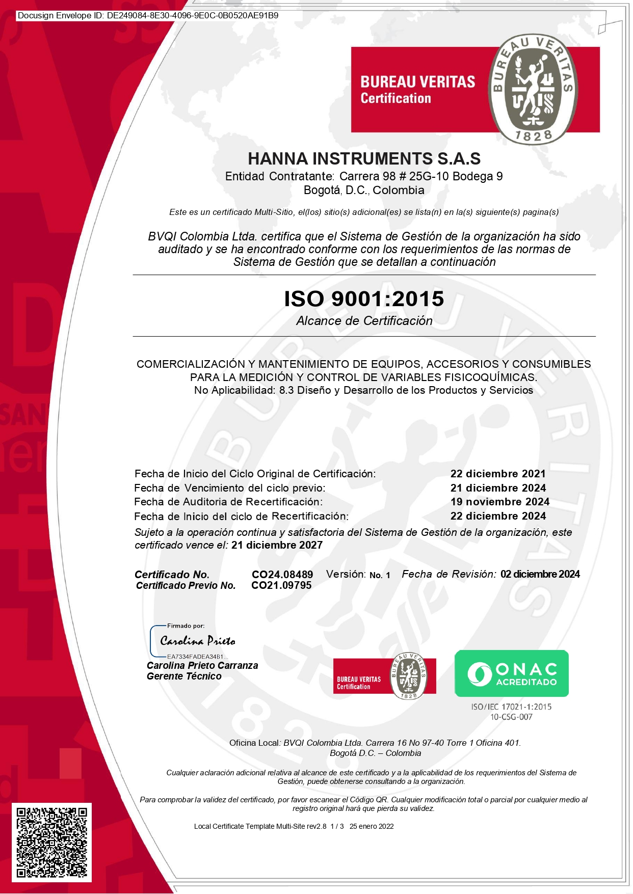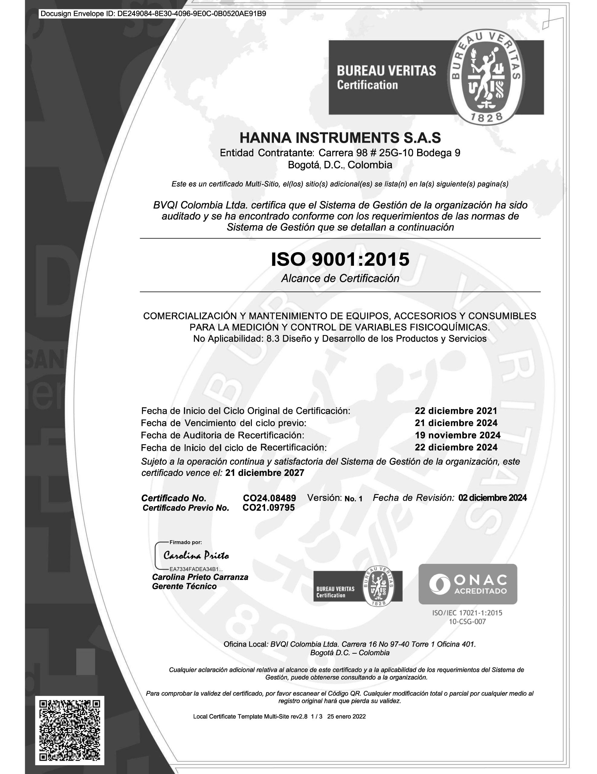 En HANNA Instruments nos enorgullece anunciar que hemos obtenido la certificación ISO 9001 otorgada por Bureau Veritas, uno de los organismos de certificación