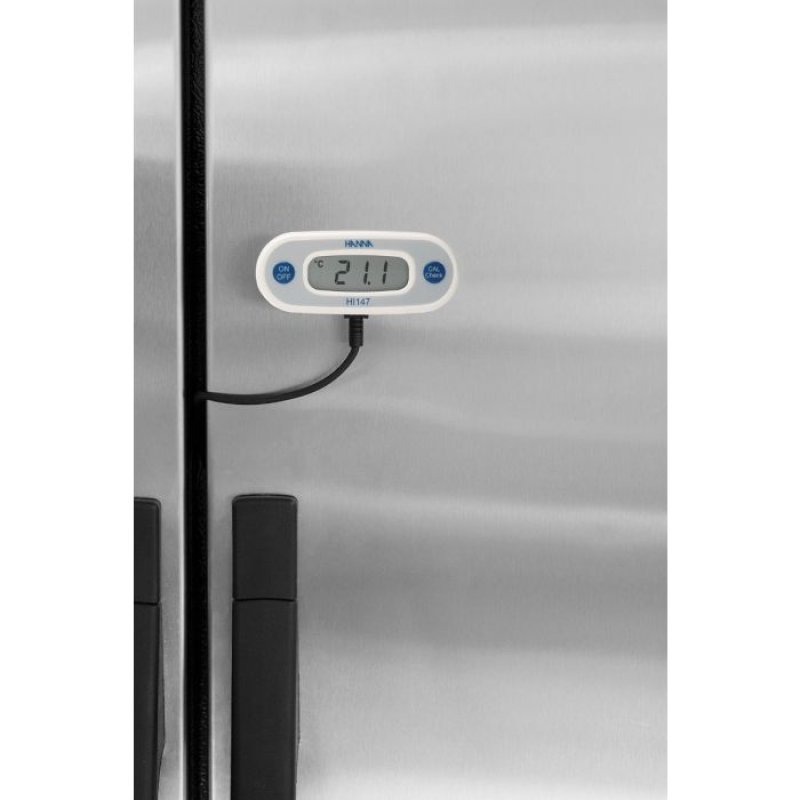Estos termómetros están especialmente diseñados con un cable de silicona compatible con alimentos, y puede ser usado para un control continuo de la temperatura en áreas de cuidado de alimentos. Simplemente conecta el medidor al exterior de un frigorífico o cabina metálica. Esto es posible gracias a los dos imanes situados en la parte trasera de la unidad. La sonda puede entones ser insertada dentro del frigorífico o armario para un control de temperatura continuo. Un selector permite un chequeo rápido de la calibración del medidor en cualquier momento.