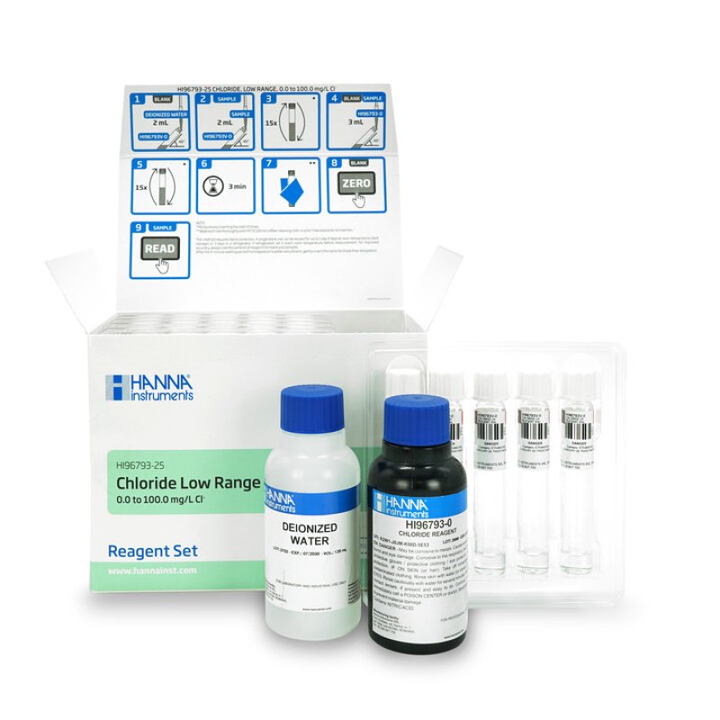 HI96793-25 Cloruro, reactivo pre dosificado de rango bajo para 25 pruebas, se suministra con certificado de análisis.